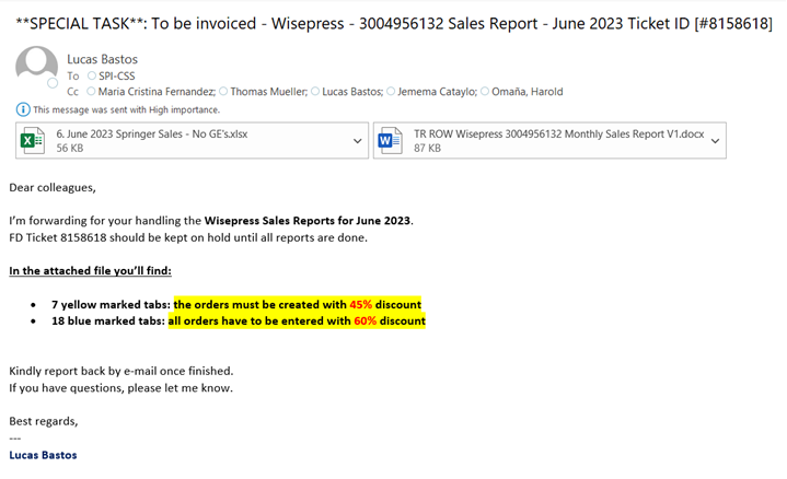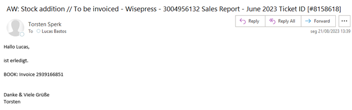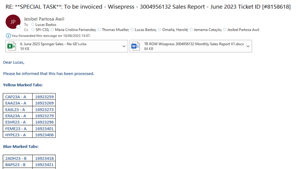 On a monthly basis, SNCS 2nd Level (Heidelberg, Trade ROW Books team) receives the Sales Report for the consignment account of Wisepress (sent over by the responsible sales manager) and sends an e-mail with a Special Task for Straive to process a separate invoice for each exhibition (or conference). The sales report will be sent over by the sales manager to the following e-mail inbox: ROW-NWEuropeOceania@springer.com, and therefore it’ll create a Freshdesk ticket, which should be kept on hold until all activities described hereunder are successfully finished.