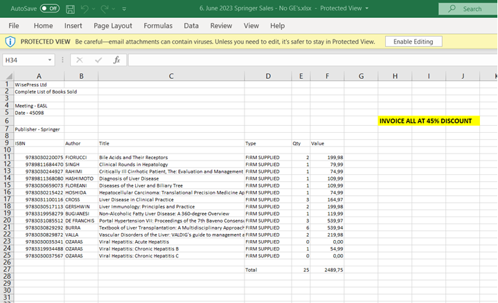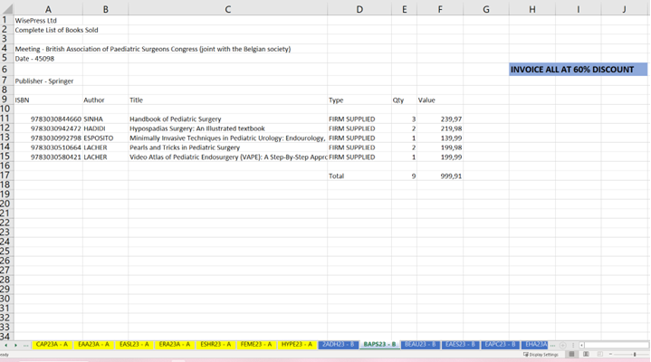 In the spreadsheet you’ll find the relevant ISBN and quantity of each item sold. Please mind the quantities in Column E; If the quantity shown is 0 (zero), this line must be ignored (no need to add it to the order’s entry).