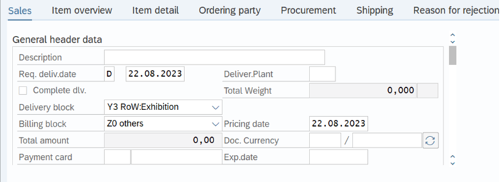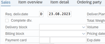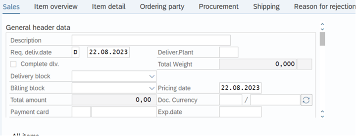 Once these steps on the “header” are finished, go back (by clicking the “Back” button on top of the MPS screen or pressing F3 on the keyboard) to the initial screen of the order, in the “Sales” tab and set: