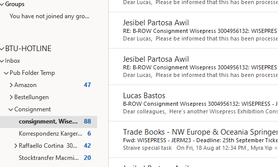 Currently we archive all these emails in the “BTU-HOTLINE” (Trade ROW Books’ common Outlook inbox), inside the folder “Consignment”, subfolder “consignment, Wisepress”: