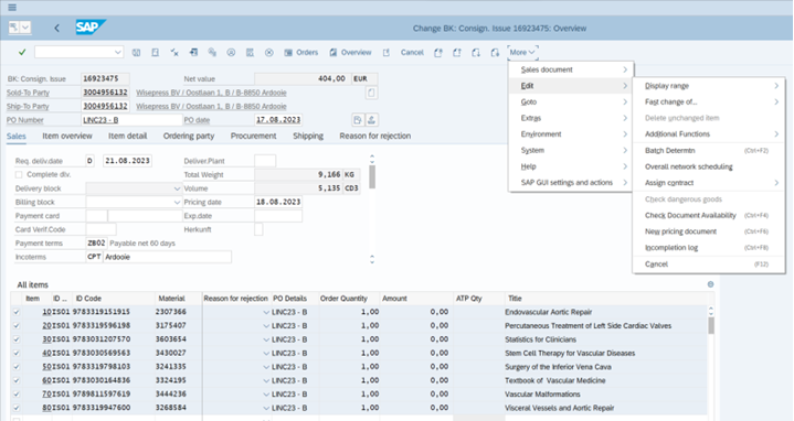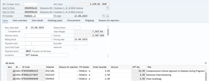If everything is correct and the stock quantity of all ISBNs are enough, remove the Delivery and Billing blocks and save the order.